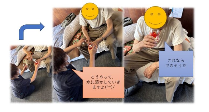この写真は、新たに追加となった新しい薬の飲み方・手順を伝えているところです。